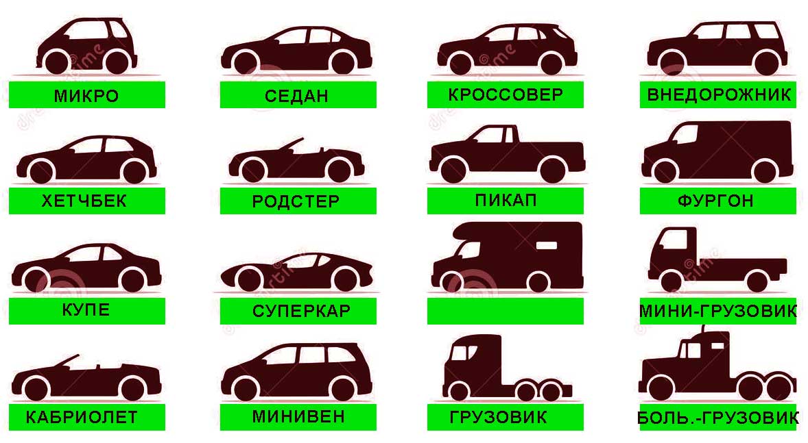 Некоторые виды легковых машин во всех странах носят одно название, некоторые называются по-разному. Далее будут рассмотрены наиболее распространенные из них с указанием отличительных характеристик.