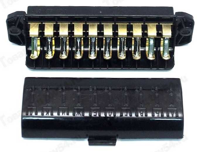 Эти два блока соединены между собой. В верхнем блоке установлено 10 предохранителей, а в нижнем – 6. Маркировка слева направо: