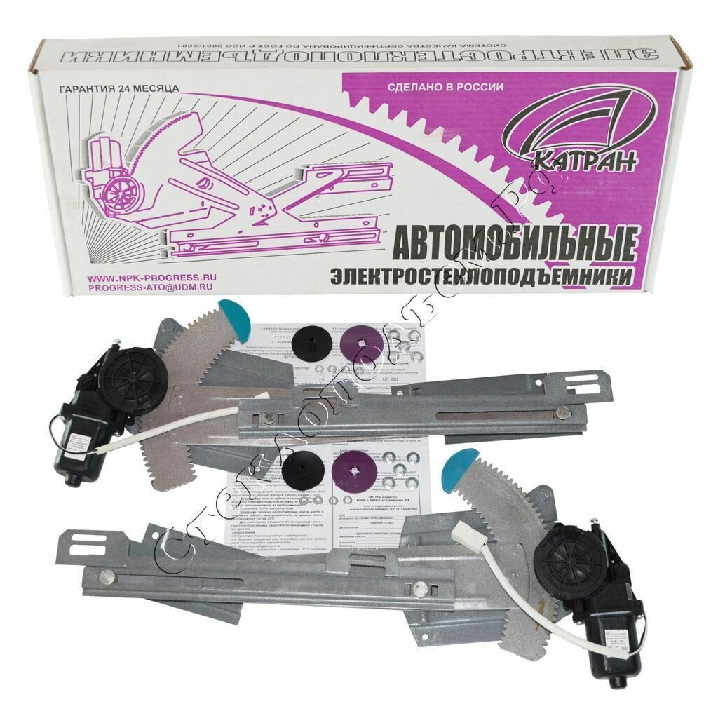 В состав комплекта входят: два электростеклоподъемника, жгут электропроводки, два переключателя стеклоподъемников 92.3709 с рамками, заглушки отверстий в дверных картах от ручек механических стеклоподъемников, паспорт с указаниями по установке.