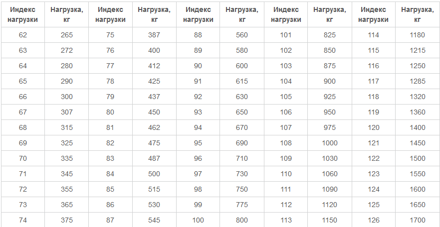 Индекс нагрузки шины — это выражение максимальной нагрузки в килограммах, которую может выдержать шина при скорости, указанной соответствующим индексом и при определенном давлении воздуха в ней. Чем выше индекс нагрузки, тем больше грузоподъёмность шины. Зная индекс нагрузки шины, Вы можете выбрать шины, соответствующие функциям Вашего автомобиля. Индекс нагрузки особенно важен для такого автотранспорта, который часто перевозит тяжёлые грузы, это коммерческий транспорт и, например, пикапы.