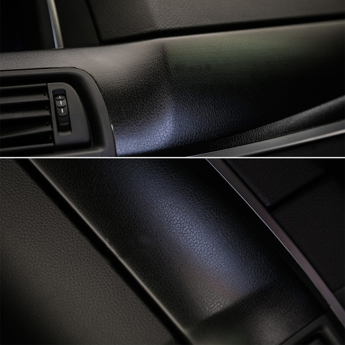 Есть важный момент — чтобы по окончанию работы интерьер смотрелся однородно, нужно чтобы на всех обклеенных панелях был один и тот же угол наклона текстуры. Помним об этом, когда будем кроить плёнку для всех элементов салона.Перед поклейкой деталь вытираем начисто и немного прогреваем феном для лучшей адгезии (прилипания). Затем снимаем на пленке защитный слой, на пластиковую панель салона накладываем плёнку и, прогревая её феном, начинаем разглаживать и выводить выгонкой пузыри воздуха. В сложных местах (впадины, разноуровневые переходы) плёнку необходимо более сильно прогревать и вытягивать.