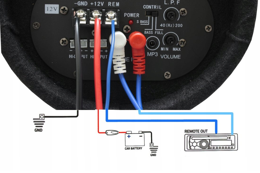 Ещё необходимо подключить управляющий провод (REM). Как правило, он идёт вместе с межблочными проводами, но бывает что его и нету, приобретите отдельно необязательно чтобы он был большого сечения 1 мм2 вполне достаточно. Это провод служит управлением для включения усилителя т. е. когда выключаете магнитолу она автоматические включает ваш усилитель или сабвуфер. Как правило этот провод на магнитоле имеет синий цвет с белой полоской, если его нет то используйте синий провод. Подключается он к усилителю к клеме под названием REM.