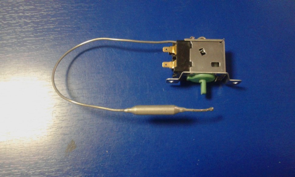 Представьте себе лампочку в вашей комнате, теперь задумайтесь, благодаря чему вы её включаете и выключаете. Тут все ответят, конечно выключателем, а вот теперь давайте разберём работу этого выключателя. Обычно к нему подходят два провода, один от центральной электросети, а другой от лампочки и чтобы отключить эту лампочку, наш выключатель разрывает контакты, соответственно чтобы включить, он их замыкает. Принцип работы терморегулятора, практически ничем не отличается, то есть его задача замкнуть контакты, а потом их разомкнуть. Вернемся опять к выключателю нашей лампочки, в данном случае вы нажимаете на него и тогда свет либо гаснет либо загорается. В термостате происходит тоже самое, только нажимает на кнопку не ваша рука, а специальная гармошка к которой подсоединена сильфонная трубка. В эту трубку закачен фреон и благодаря ему, гармошка в термостате сужается или расширяется, это происходит в результате охлаждения трубки термостата. Теперь немножко расскажу про саму трубку, которая идёт от терморегулятора и крепится к морозильному испарителю.