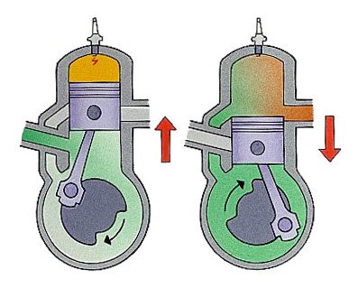 Рабочий цикл двухтактного двигателя состоит из впуска и выпуска происходящего за один оборот коленчатого вала, тогда как 4-х тактный имеет следующие циклы — впуск, сжатие, рабочий ход, выпуск. И протекают они за два оборота маховика. В двигателе с 4 тактами впуск и выпуск осуществляются в виде разных процессов, в двухтактнике они совмещены со сжатием топливной смеси и расширением рабочих газов. Принцип действия двухтактного двигателя: