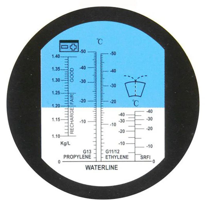 Линия разграничения, в случае с чистой водой, должна указывать на ноль по шкале прибора. Теперь, если воду заменить на антифриз, то это значение измениться в большую сторону (выше 0°C). Полученный результат и будет показателем качества жидкости.