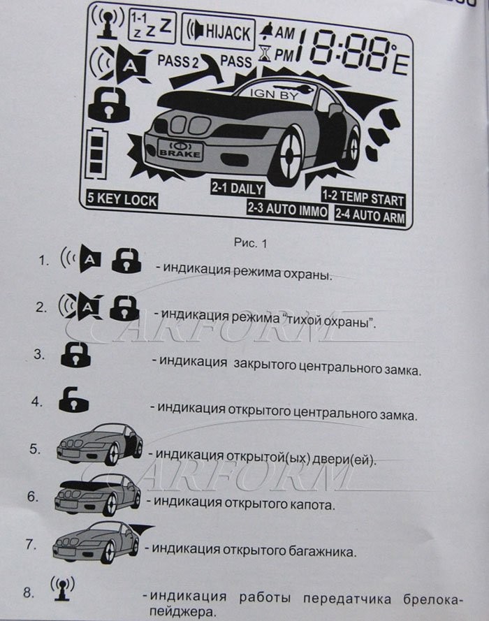 Аналогично обстоят дела с пиктограммами. Каждая иконка отвечает за обозначение определенного режима, его активации и состояния системы. Точное значение картинок можно найти в руководстве пользователя сигнализации.