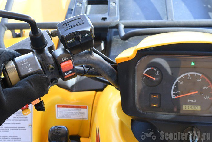 - Трансмиссия переставляется в нейтральное положение. Если есть сцепление, его выжимают, после чего рычаг переставляется на «нейтралку». На панели в большинстве моделей в этот момент загорается соответствующий индикатор. Чтобы проверить правильность собственных действий, можно толкнуть квадроцикл. Если колеса крутятся, значит, все сделано правильно.