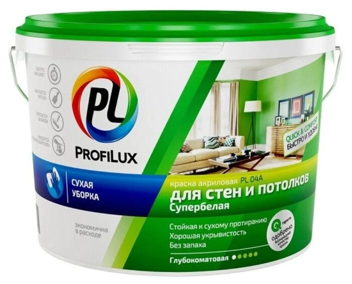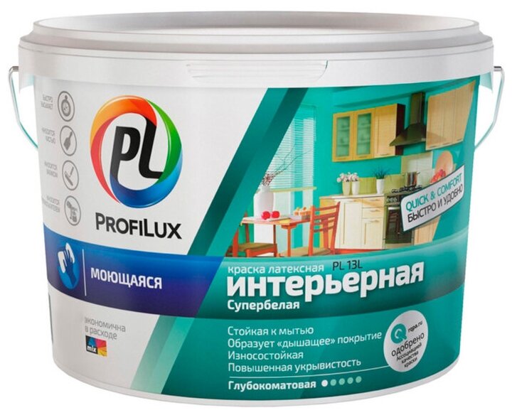 «Profilux» ВД краска PL- 13L — одно из наиболее стойких покрытий среди интерьерных красок бренда Profilux.