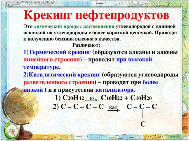 - Каталитический крекинг , в котором используется катализатор и который дает высокие выходы разветвленных и циклических алканов