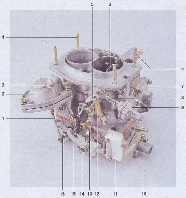 : 1 — тяга привода дроссельной заслонки вторичной камеры; 2 — пневмопривод дроссельной заслонки вторичной камеры; 3 — болт крепления корпуса воздушной заслонки приводной тяги; 4 — шпилька крепления корпуса воздушного фильтра; 5 — муфта с винтом крепления тяги привода воздушной заслонки; 6 — воздушная заслонка; 7 — крышка ускорительного насоса; 8 — пусковое устройство штока диафрагмы; 9 — пусковое устройство; 10 — принудительный холостой ход экономайзера; 11 — микровыключатель; 12 — телескопическая штанга; 13 — патрубок для отвода картерных газов; 14 — ось дроссельной заслонки первичной камеры; 15 — возвратная пружина, блокирующая открытие заслонки вторичной камеры; 16 — ось дроссельной заслонки вторичной камерыНа автомобиле установлен карбюратор модели 2107-1107010.