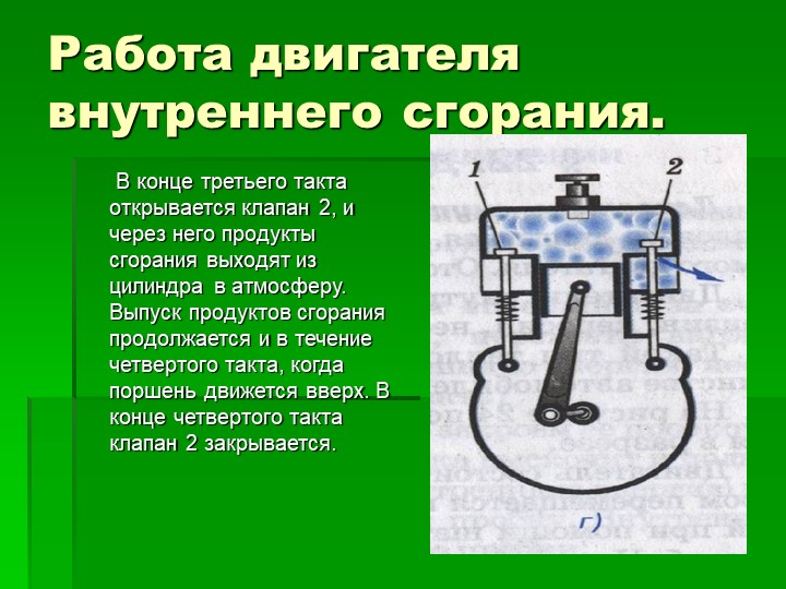 давление на поршень, который затем отводится от головки блока цилиндров в третьем такте. В конце рабочего такта давление сгоревших газов в цилиндре равно 2.От 8 до 3,5 кг / кв. см (от 40 до 50 фунтов / кв. дюйм). Во время последнего штриха выпускной клапан открывается, и поршень движется к головке блока цилиндров, приводя в движение выхлопные газы из камеры сгорания и оставление цилиндра готовым повторить цикл.