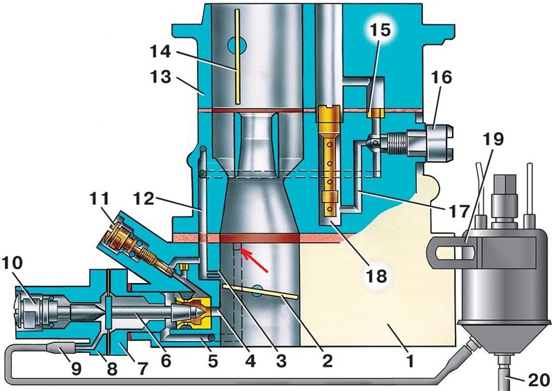 Карбюратор можно назвать сердцем питающей системы двигателя. Он отвечает за «приготовление» топливно-воздушной смеси, которая будет подана в цилиндры двигателя. Если вкратце, то суть работы этого агрегата в том, чтобы создавать топливовоздушную смесь. Кроме того, в карбюраторе имеется диффузор, который отвечает за подачу топлива – двигатель не всасывает его сам, как считают многие автолюбители. Также карбюратор позволяет двигателю нормально работать при разных режимах.