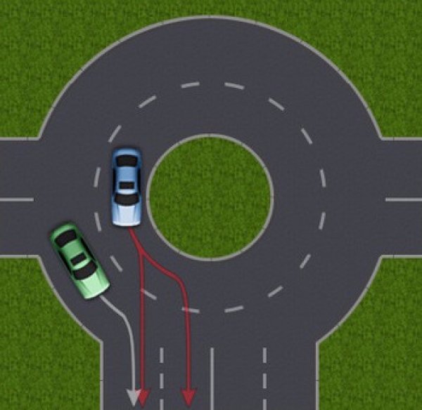 На приведенном выше рисунке водитель оранжевого автомобиля пытается сразу выехать на вторую полосу кругового движения, хотя ничто не мешает ему повернуть по правилам.