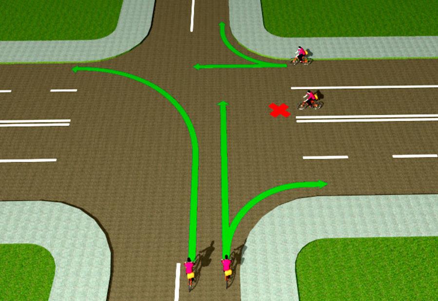 Готовясь к повороту, пройдите как можно дальше вправо. Не делайте широких размашистых поворотов. Если знаки не указывают на иное, сверните на правую полосу дороги, на которую вы выезжаете. См. Пример ниже.