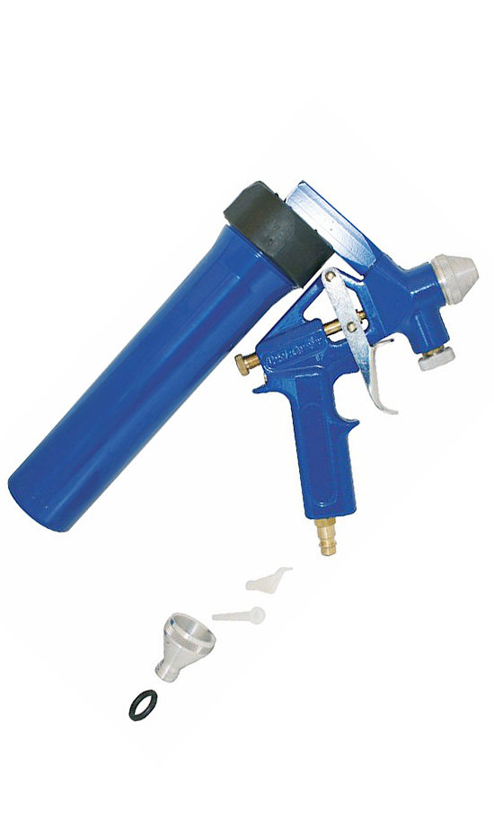 Управление процессом мастер ведет нажатие на спусковой крючок, соединенный с механизмом клапана подачи воздуха. Все выпускаемые в настоящее время пистолеты для антикора скомпонованы по схеме с нижним расположением бачка.