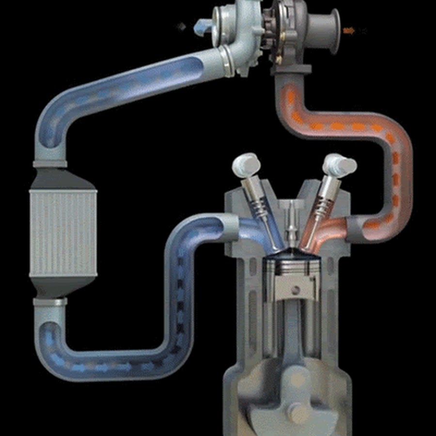 Основная идея заключается в том, что выхлоп приводит в движение турбину (красный вентилятор), которая напрямую подключен (и питает) компрессор (синий вентилятор), который нагнетает воздух в двигатель.Для простоты мы показываем только один цилиндр. Итак, вкратце, как все это работает:
