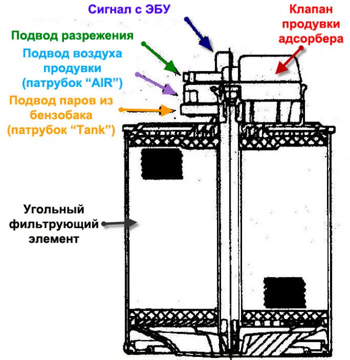 Образующиеся в топливном баке пары бензина проникают в сепаратор, где они конденсируются и снова сливаются в бак. Какая-то часть паров не успевает конденсироваться в сепараторе и попадает через паропровод в адсорбер. В фильтрующей системе они поглощаются активированным углем, накапливаются и затем при запуске двигателя подаются во впускной коллектор. Процесс поглощения топливных испарений проходит только при отключенном двигателе. Когда автомобиль работает, электронный блок управления открывает электромагнитный клапан продувки адсорбера, через который поступает воздух и таким образом происходит вентиляция. При этом накопившийся конденсат вместе с воздухом высасываются из адсорбера и снова попадает в двигатель, где происходит его дожигание. Клапан адсорбера обеспечивает вентиляцию всего механизма и направляет топливный конденсат назад в двигатель.