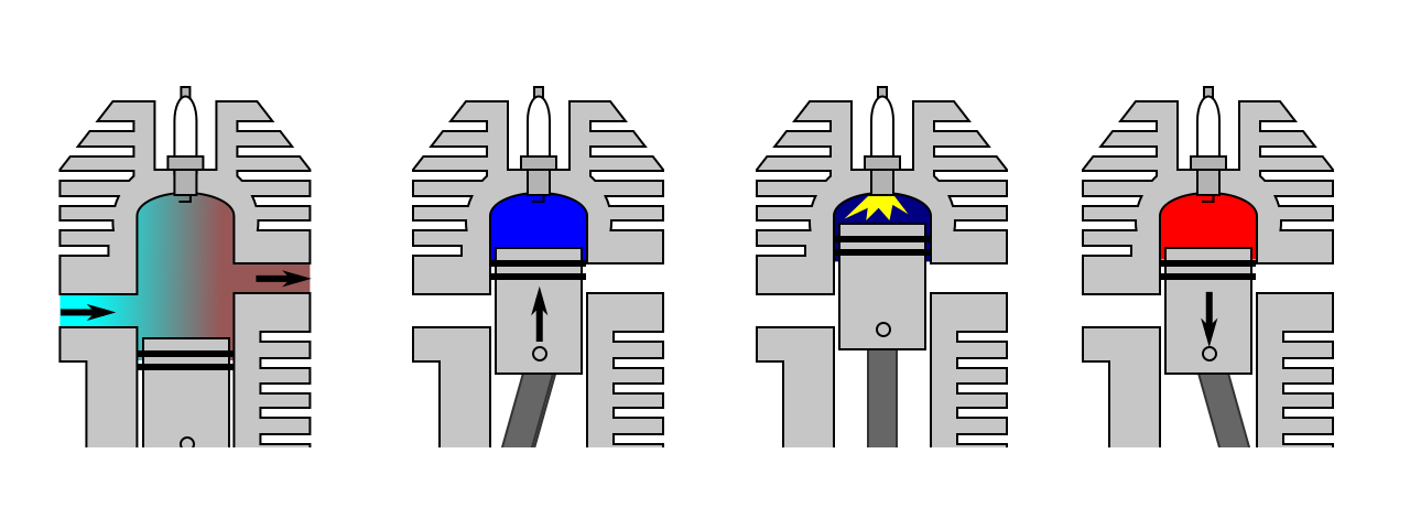 Когда в камеру сгорания поступает достаточно топлива, клапан закрывается и создается вакуум и герметизация цилиндра. После свеча зажигания дает искру вызывающую воспламенение горючей смеси (взрыв смеси), это заставляет поршень двигаться вниз. Затем открывается выпускной клапан, позволяющий отходящим газам выходить. В это время герметизация нарушается, что вызывает декомпрессию в цилиндре, и импульс коленчатого вала толкает поршень обратно в верхнее положение ВМТ, и весь процесс начинается заново.