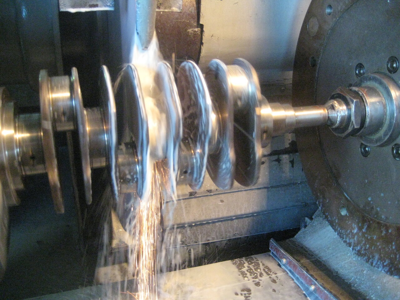 В первую очередь приступаем к шлифовке шатунных шеек. Все правильно, именно с шатунных т.к. это самое слабое место коленвала. Дело в том, что у коленчатого вала имеется внутреннее напряжение и если шлифовку начать с коренных, а затем приступить к шатунным, то ось коленвала может деформироваться (напряжение в поверхностном слое изменит свое значение). Если это произойдет, то в лучшем случае коренные шайки придется перешлифовывать заново в следующий ремонтный размер иначе вал не будет крутиться в постели.