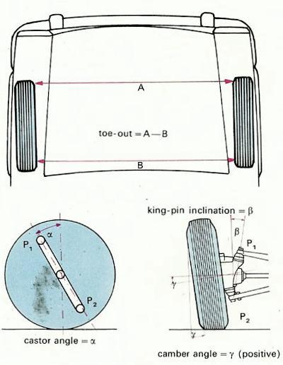 - Caster: положительный поворотный механизм помогает стабилизировать автомобиль на высоких скоростях, увеличивая наклон шин при прохождении поворотов и увеличивая усилие на рулевом колесе.