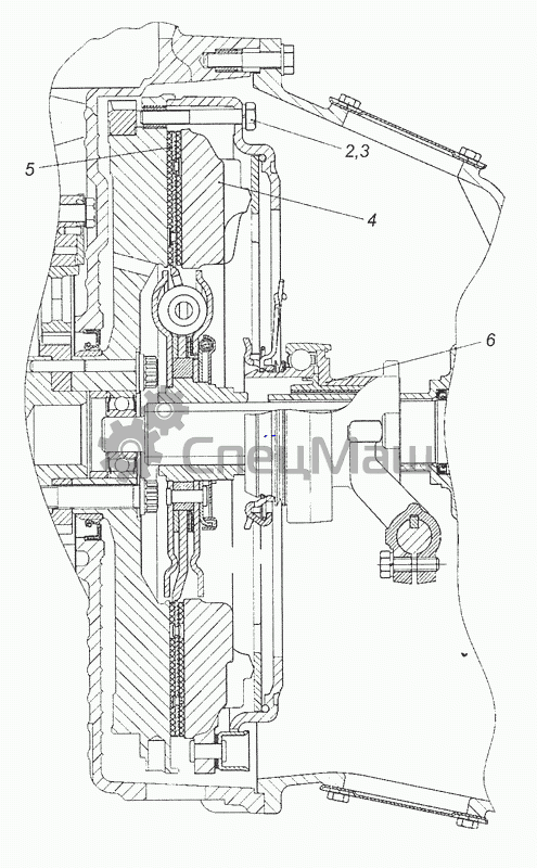 Приводной, нажимной и нейтральный диски снабжены четырьмя рычагами, входящими в пазы на маховике, которые передают крутящий момент от двигателя на плоскости контакта ведомых элементов, установленных на шлицах вала коробки.