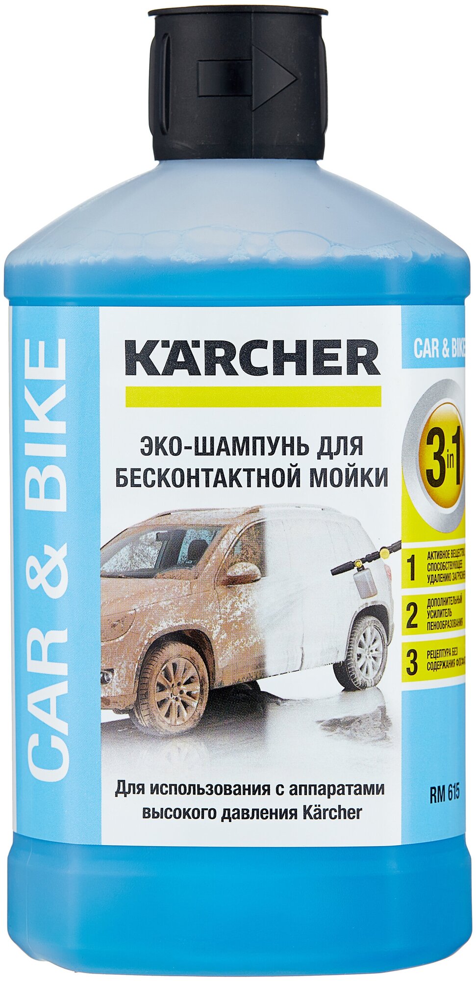 Этот шампунь является концентрированным средством, которое дополнительно обладает полирующим эффектом, может использоваться не только для легковых автомобилей, но для цистерн, трейлеров и так далее. Данная продукция отечественного производства, но изготавливается она под строгим контролем немецких специалистов из компании Karcher. С его помощью можно полностью удалить любой слой пыли и стойкой грязи, формула шампуня идеально сочетается с любыми видами восков. Пены образуется достаточно много – средняя толщина слоя получается от 0,5 до 1,5 см. Средство не будет разъедать резиновые или хромированные поверхности, является абсолютно безвредным для человеческого здоровья – не приводит к раздражению глаз или кожи.