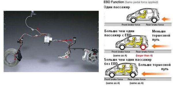 На фото можно удивить как работает система распределения тормозных усилий ebd