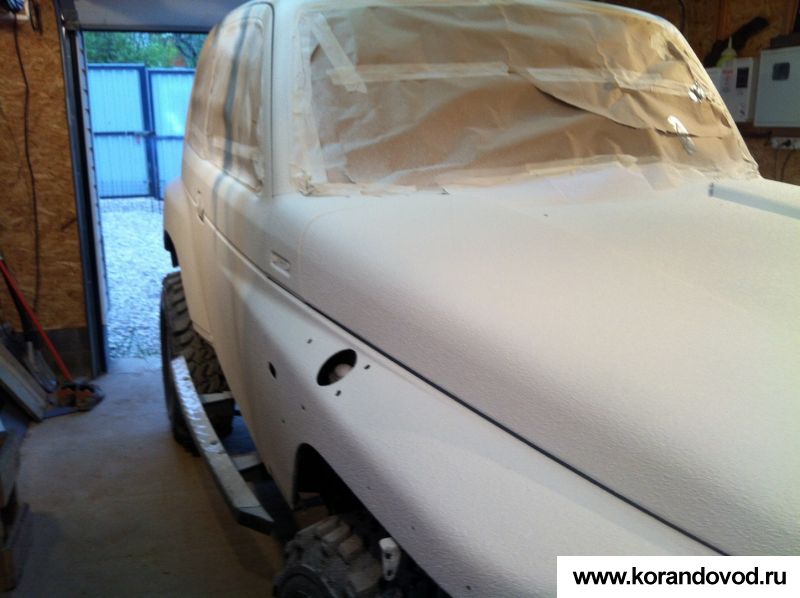 Если у вас стоит задача нанести такое покрытие на неповрежденный участок кузова, на котором есть небольшие сколы, то мойки, матирования поверхности и нанесения слоев антигравия будет достаточно. Не беспокойтесь о мелких царапинах и сколах, гравитекс по типу раптора скрывает все мелкие неровности, заполняя их, а за счет своей структуры визуально выравнивает плоскость детали. Если вы зачищали участки с ржавчиной до металла, то желательно предварительно загрунтовать поверхность с помощью эпоксидной грунтовки. Далее ее также матируют.