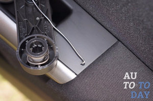 Необходимо разобрать дверь автомобиля. Обязательно необходимо демонтировать ручки двери и подлокотник. Для этого нужно поддеть декоративные заглушки отвёрткой. Далее берёте крестовидную отвёртку и откручиваете винты, держащие ручку подлокотника. Чтобы убрать карман двери, необходимо открутить удерживающие его саморезы. На ручке, открывающей дверь, есть накладка. Её необходимо поддеть и также снять. Это делается для того, чтобы отвинтить кнопку, блокирующую дверь. Далее с помощью плоской отвёртки нужно поддеть обивку. Обивка удерживается на месте восемью пистонами. Сняв пистоны, вы легко удалите обивку.