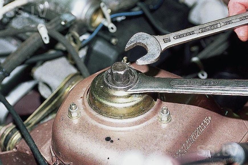 …накидным ключом «на 27» отворачиваем гайку крепления верхней опоры, удерживая шток от проворачивания шестигранником «на 6».