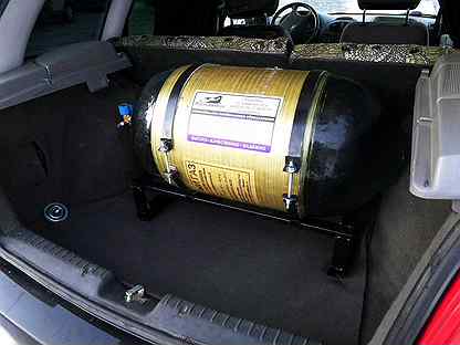 Большой бак, часто 100 литров, вмещается в багажник автомобиля. Затем по всей длине автомобиля проходит трубопровод с клапанами на каждом конце, один на баке, а другой соединяет систему сжиженного нефтяного газа с бензиновым двигателем.
