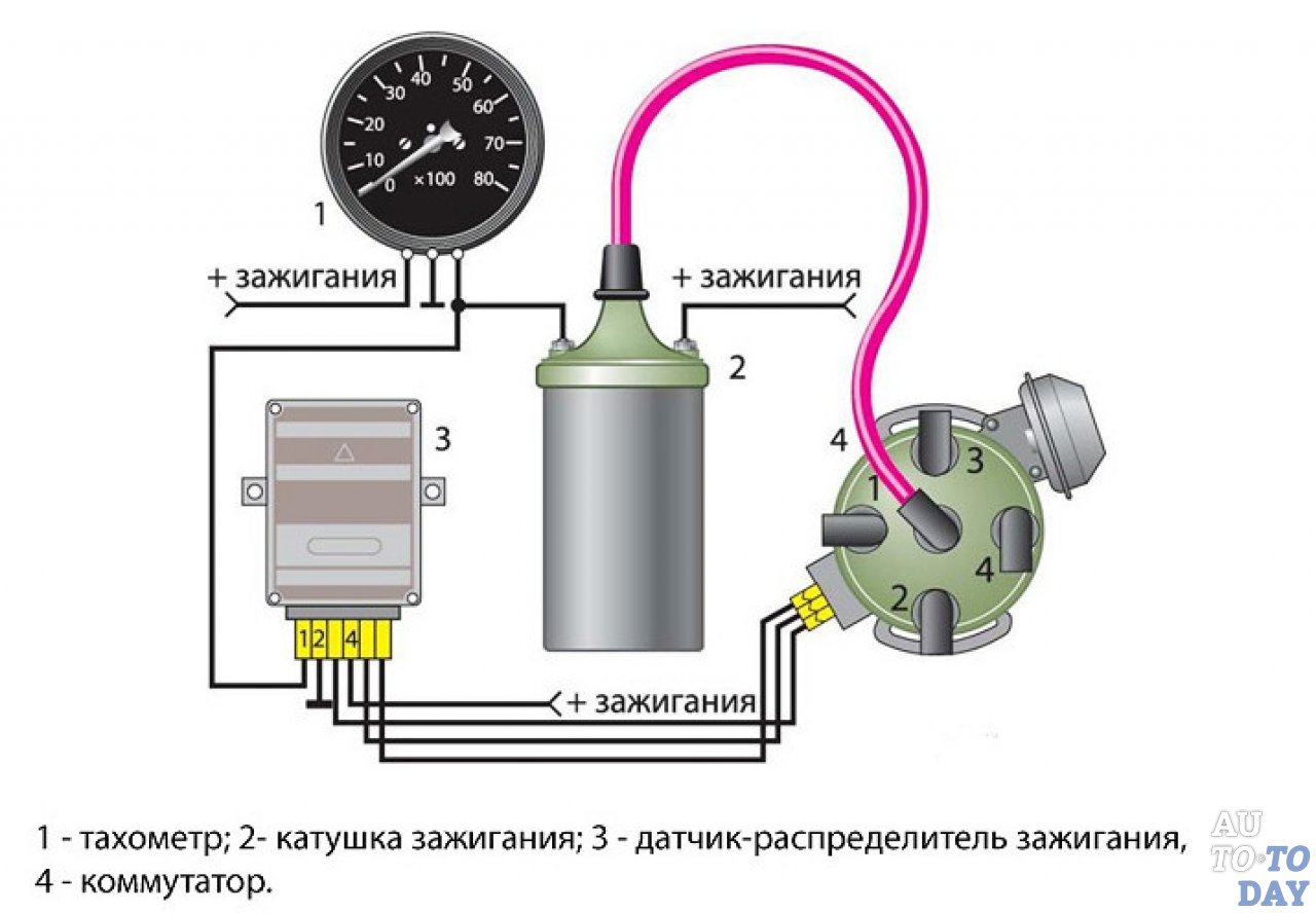 У карбюраторных машин входной импульс с вывода «К» катушки зажигания подается на контакт 3 разъема «А» (красного). Амплитуда этих импульсов может достигать 400 В, поэтому на печатной плате КП установлен дополнительный резистор 91 кОм.