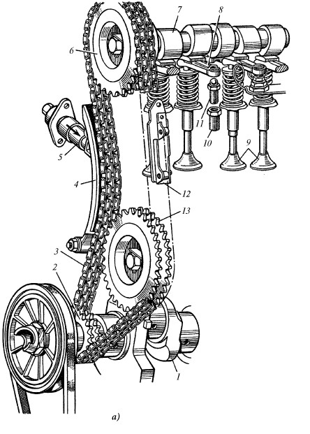 Распределительный вал двигателя, располагаемый в блоке цилиндров, приводится в движение зубчатой или цепной передачей от коленвала.