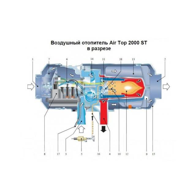 После включения отопителя начинает работать нагнетатель воздуха (6) и продувает камеру сгорания (9) и выхлопную систему (19). Одновременно блок управления (3) тестирует все электрические компоненты и датчики. Далее, если нет ошибок, топливо из бака поступает в камеру сгорания (9) при помощи топливного насоса (22) и воспламеняется с помощью штифта накала (7). Газы после сгорания воздушно-топливной смеси выходят через выхлопную систему с пламегасителем. При этом нагнетатель (2) прогоняет воздух через теплообменик (12) отопителя, разогревая его.