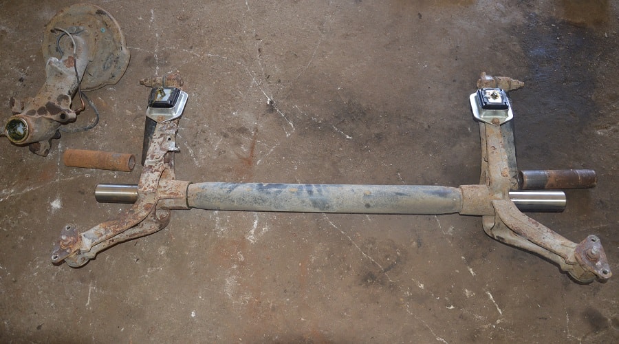 - Открутите болты и отсоедините обе задние оси от их продольных рычагов. Подвесьте их в сторону, используя банджи-шнуры или проволоку.
