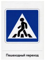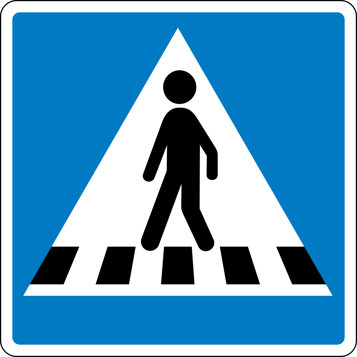 Человек переходит дорогу в белом треугольнике на синем квадратном фонеОписание знака